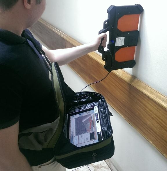 該裝置的操作原理是操作者將天線模塊導向墻壁。 然后即可在計算機屏幕上觀察當物體在墻后移動時反射信號的雷達圖的變化。