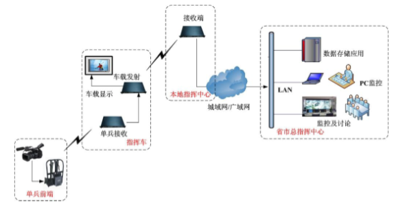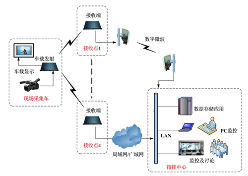 前端現場采集車安裝大功率車載設備在城市各區內巡邏,實時將采集的音視頻信息傳給就近接收點,接收點用微波、光纖或專網等設施傳輸給指揮中心。