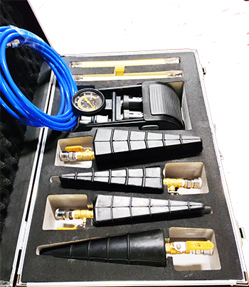 用于快速封堵背壓≦0.1Mpa,泄漏介質溫度≦60℃的存儲罐、油罐車、液柜車裂縫,不需要拉伸帶。操作人員堵漏時將槍頭、槍桿、連接氣管、腳踏氣泵連接在一起,手持槍桿在安全距離外,將楔形或圓錐形密封袋插入于直徑15至60毫米的裂縫里面,以及直徑30至90毫米的漏孔內,并迅速充氣密封裂縫。