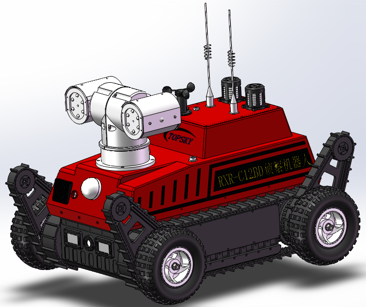 底盤采用全地形設計,即前后4擺臂+履帶+金屬輪胎的三合一底盤結構,能適應各種地形快速作戰部署,用于代替救援人員進入復雜環境、危險場地的機器人,對環境進行視頻采集,監測有害氣體濃度、輻射強度等數據,實時傳輸至指揮中心,以便掌握現場境況,及時采取有效