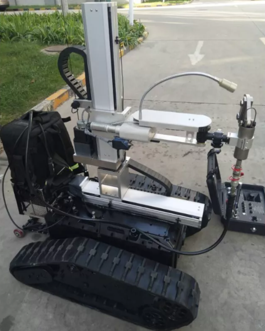 破拆機器人,也可用于遠程遙控偵察人難以達到的地形的一種機器人。機器人配備十字滑臺,靈活調動工具的工作位置,可加載手持式切割機,還可以加載獨立電動液壓工具其包括:微型開門器、微型擴張器、微型剪切器之間可以靈活更換,底盤采用履帶結構,能適應各種地形快速作戰部署。