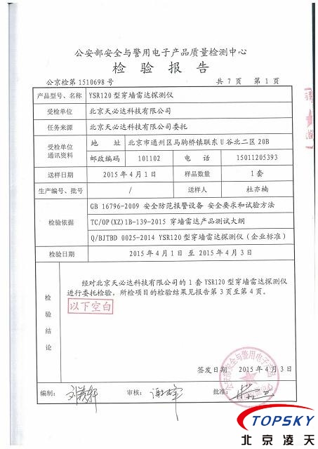 近日,北京天必達科技有限公司研發的YSR-120穿墻雷達探測儀通過公安部安全與電子產品檢測檢驗中心檢驗,檢測報告編號:公京檢第1510698號。