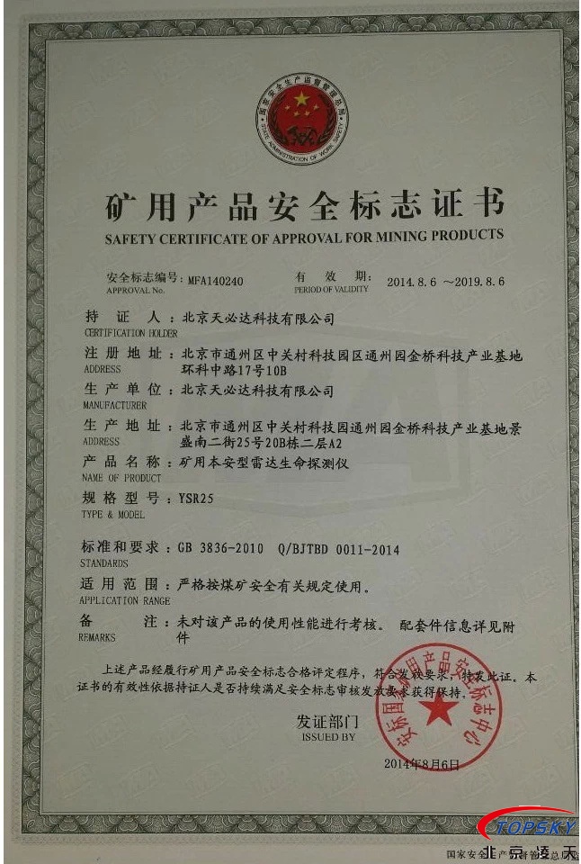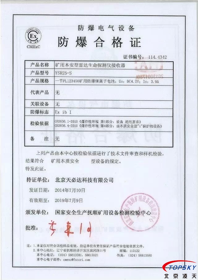 從國家安標中心獲悉,YSR25本安型雷達生命探測儀取得煤安標志認證(證書見下圖),自此,國內本安型可用于爆炸性環境的探人雷達取得完整下井資質,從研制方獲悉,該設備已在山西陽泉煤業集團救護大隊、山西潞安集團救護大隊、開灤集團救護大隊進行過工業性試驗,試驗效果良好,探測距離達到25米(報告見下圖)!
