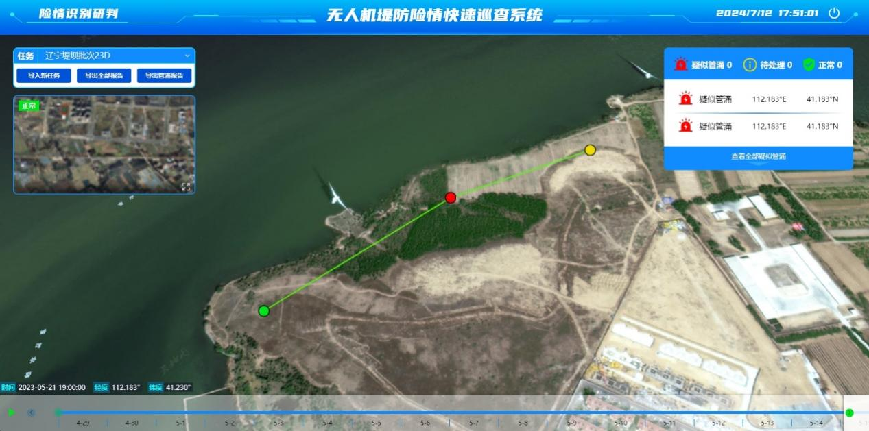 系統(tǒng)主要針對汛期堤防滲漏、管涌、塌陷場景進行快速排查隱患需求,以無人機搭載雙光相機匹配原理,結合人工智能辨識算法形式進行巡查;系統(tǒng)設計化繁為簡,具備GIS高清底圖,能夠展示村莊、河道名稱及經緯度信息,數據支持一鍵處理,保障高效運行。