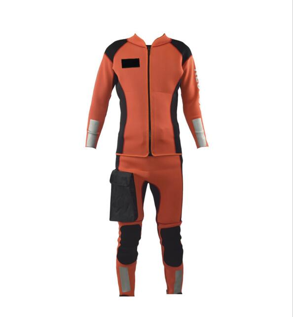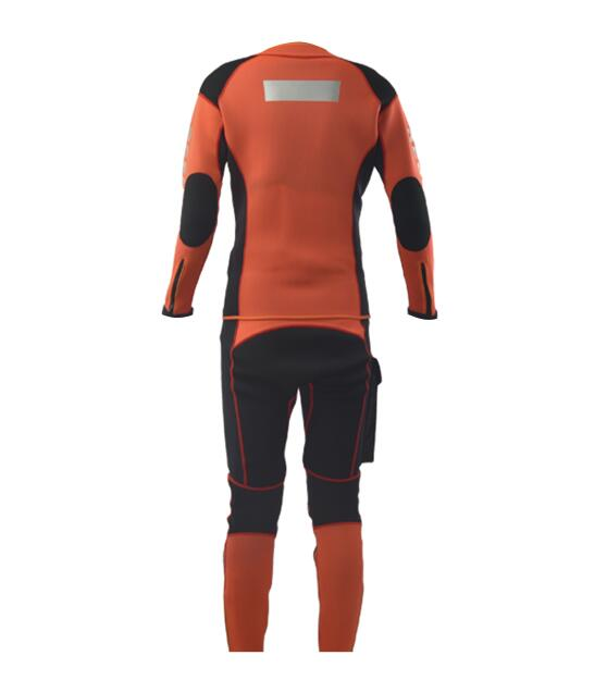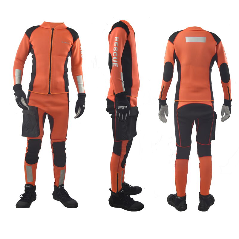 水域救援專用分體式濕式服,前開拉鏈長袖上衣和中腰褲兩件套。3mm高彈氯丁橡膠面料制作,相拼3mm超彈氯丁橡膠面料,有效的提升運動的自由度。無極調節尼龍戰術腰帶和高強度塑鋼插扣,防止衣服滑落。右腿外側設有一個防水尼龍面料立體口袋,臀部一片式、護膝、護肘易摩擦部位,均采用彈性聚酯纖維復合面料,增加救援服的耐磨性。衣袖、褲口及背后都設有彈性反光帶。領口、袖口及褲口處YKK拉鏈開合。