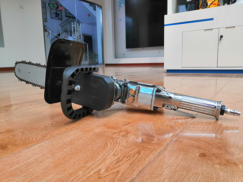 PJQL-4 礦用氣動鋸(以下簡稱氣動鋸),是我公司經過多年的探索,在機電、通風、采煤等各科室的高技術素質科技人員的通力合作下,為煤礦開發出的礦用切割與開槽工具。氣動鋸由鋸頭、鏈條、聚氨酯軟管三大部分組成,聚氨酯軟管將氣源和氣動鋸連接起來,氣源提供的氣壓驅動氣動鋸高速運轉,進行切割。工作時,冷卻水通過導板中間的孔流向切割部位,起到冷卻和降塵的作用。并且具備雙重斷水保護功能,氣動鋸在切割時采取了濕法切割水冷卻,以避免切割時出現火花。可用于采掘工作面使用的煤層、巖石切割,用于密閉墻的砌筑,也可用于礦山救援時的混凝土與巖石破拆。