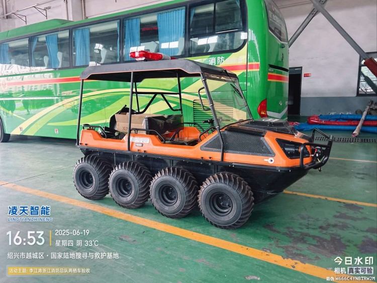 在復雜惡劣的地形條件和自然環境下,水陸兩棲全地形車可以讓搜救隊員和攜帶的救援裝備快速到達救援現場,減少徒步帶來提供消耗,完成最后一公里最好五分鐘緊急救援任務。水陸兩棲全地形車可配備點到絞盤、救援擔架組件、探照燈、警示燈、警報器、脫鉤、破拆工具等裝備, 給救援團隊提供救援保障,更安全的解救傷員和疏散群眾。