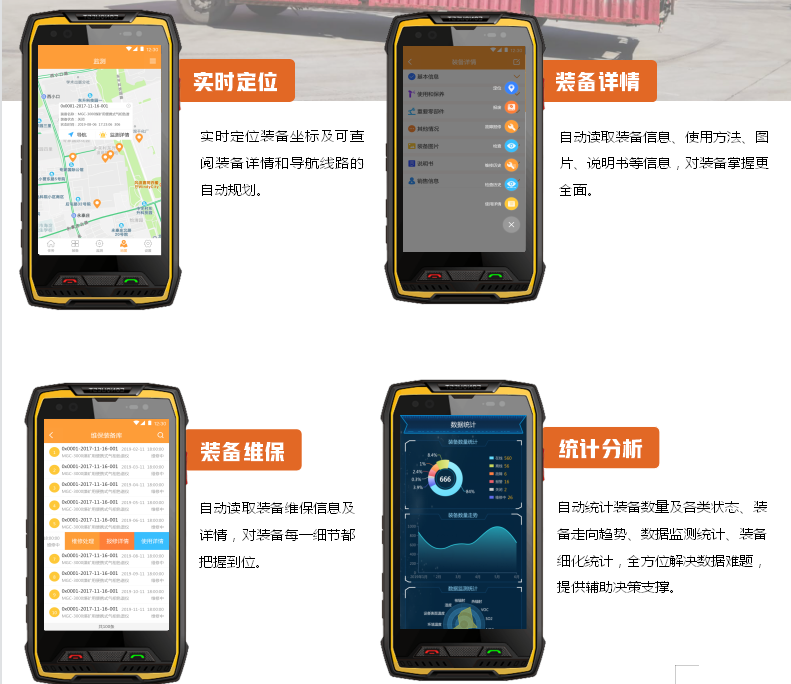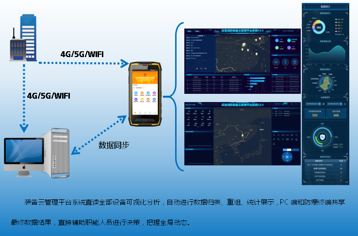 應急消防裝備云管理平臺系統能夠直接通過職能人員手持的防爆終端,直接讀取系統內所有的裝備、設備及具體的詳情、圖片、位置、傳輸的數據,根據裝備具有特性進行實時在線監測,當監測到的數據超標時,實時進行報警及查閱報警信息。該平臺系統能夠結合智能防爆終端本身功能、北斗定位/GPS定位、錄像、拍照等進行信息存儲,隨時隨地查閱裝備庫、維修庫、報廢庫等級占比利用率分析,最終進行數據統計分析處理。此外該系統支持本地化業務拓展,如:現場監控、無線打印,保障此平臺系統在不同環境中的應用與融合。