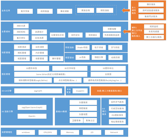 通過虛擬仿真技術、數(shù)字化技術手段,建立一個與現(xiàn)實一致的三維實景數(shù)字空間,基于實景化的數(shù)字空間,開展基于一張圖的數(shù)字化預案制作、戰(zhàn)例復盤、多人協(xié)同演練、推演會商、事故調查等應用。